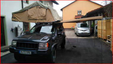 Mit Dachzelt, Markiese, Solar und Kühlschrank ist er bestens