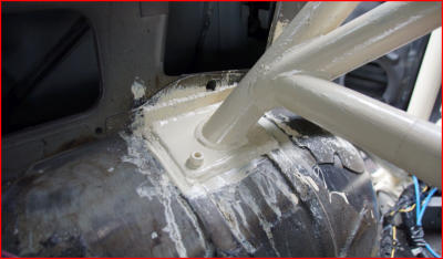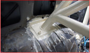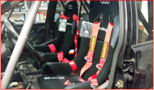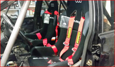 Für die neuen Sitze musste eine neue Sitzaufnahme her. Die Sitzaufnahme wurde nach der gleichen Methode wie der Käfig an der Karosserie befestigt. Die Sitzaufnahme wird auf eine Metallplatte geschweißt, die wiederum mit der Karosserie verschweißt und verschraubt wird. Für Besetigung des Gurtes dient für die oberen Gurte der Käfig. Hierbei unbedingt die Anweisungen im Handbuch der Gurte beachten. Evtl. ist ein Abstandhalter am Käfig nötig, damit der Gurt nicht verrutscht und seitlich in den Halsdrückt.Die mittleren Gurte werden mit Ringösen an der Karoserie befestigt. Als Konter dient eine auf eine Metallplatte aufgeschweißte Mutter. Diese gibt es bereits fertig bei Ihrem Händler des Vertrauens zu kaufen.Die unteren Gurte werden an der Aufnahme der Sitze befestigt wie die oberen Gurte am Käfig. Diese Vorgehensweise ist im Moment noch gültig, falls sich das ändern sollte können die unteren Gurte auch mit Ringösen befestigt werden.